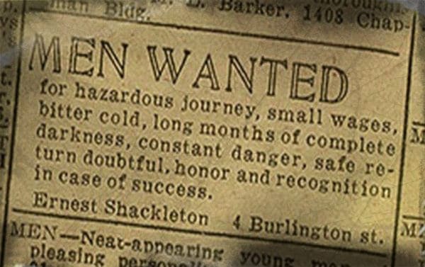 When the famous explorer, Ernest Shackleton was searching for brave souls to accompany him on his latest expedition, he placed this advert in many of the London papers in the early 1900s.